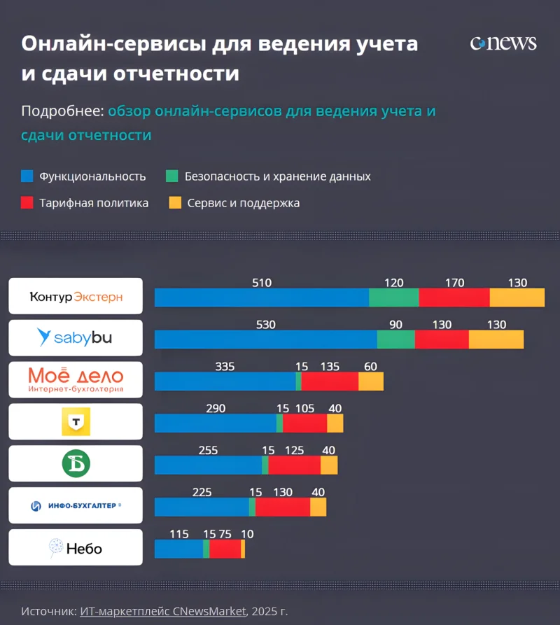 Эксперты CNewsMarket провели сравнительный анализ операционных возможностей, уровня развития экосистемы и клиентской поддержки, а также ценовых стратегий поставщиков онлайн-платформ для ведения учета и подачи отчетности.