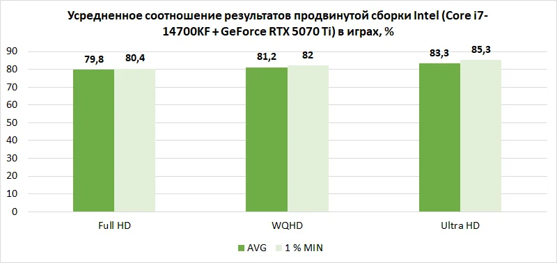 Разрешение 2K является оптимальным для данной сборки. GeForce RTX 5070 Ti проявляет себя здесь крайне уверенно, демонстрируя средние 60+ FPS в 13 тестах из 15. Согласно моим наблюдениям, во всех случаях достигается визуально комфортная и плавная картинка.