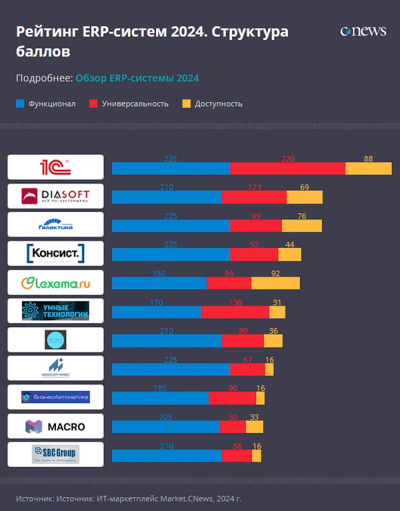 Платформа Market.CNews представила ежегодный рейтинг ERP-решений за 2024 год. Специалисты выполнили детальный анализ возможностей, моделей поставки, отраслевых предложений, ценовых условий и иных параметров продуктов, доступных на отечественном рынке.