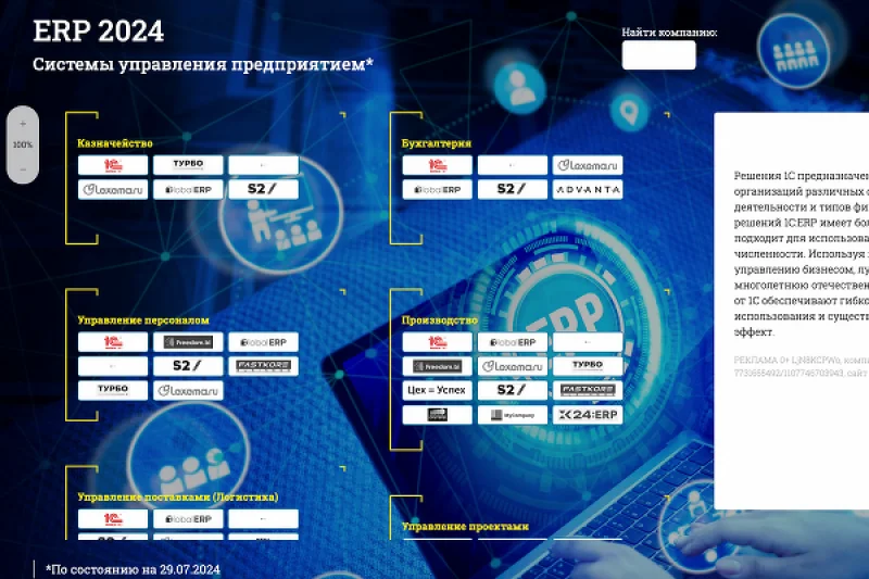 ИТ-площадка Market.CNews обнародовала первую в России карту ERP-рынка за 2024 год. Специалисты систематизировали сведения об отечественных продуктах различных категорий и визуализировали их в наглядном формате.