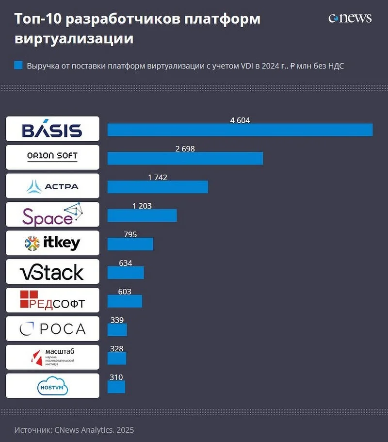 Быстрое развертывание и обновления, масштабный перенос виртуальных сред, сетевая виртуализация, аварийное восстановление — это ключевые возможности, которые ожидает клиент при выборе отечественной платформы виртуализации. Среди ведущих технологических направлений — внедрение гибридных и мультиоблачных архитектур, периферийные вычисления, защита данных и, безусловно, искусственный интеллект. CNews Analytics впервые представил рейтинг «Крупнейшие поставщики платформ виртуализации». В расчет брались проекты по внедрению систем вместе с VDI, поскольку у некоторых производителей платформа виртуализации и решение для виртуализации рабочих столов поставляются как единый продукт. Первое место в исследовании заняла компания «Базис». В 2024 году ее доход на рынке виртуализации достиг 4,6 млрд рублей, показав рост выручки за год на 52%. На второй строчке оказался Orion soft. Компания получила 2,7 млрд рублей. Годовой прирост составил 60%. Тройку лидеров завершает «Группа Астра». Здесь учтены результаты «Увеон» и ISPsystem. Их совокупный показатель на рынке виртуализации по итогам 2024 года равен 1,7 млрд рублей.