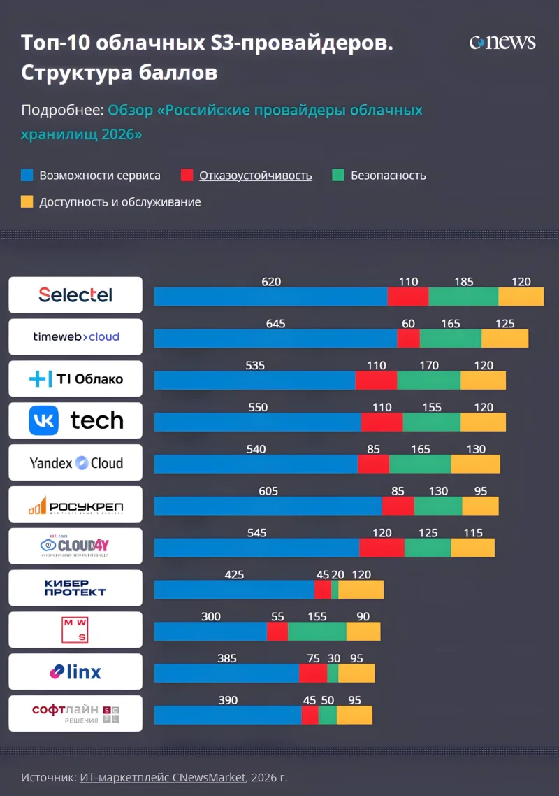 CNewsMarket впервые составил рейтинг отечественных поставщиков облачных хранилищ, совместимых с протоколом Amazon S3. Этот сервис позволяет размещать значительные объемы неструктурированной информации с возможностью репликации, применением политик управления жизненным циклом (версионирование, удаление, перемещение и другие операции) и администрированием через веб-интерфейс или API с HTTPS-доступом.