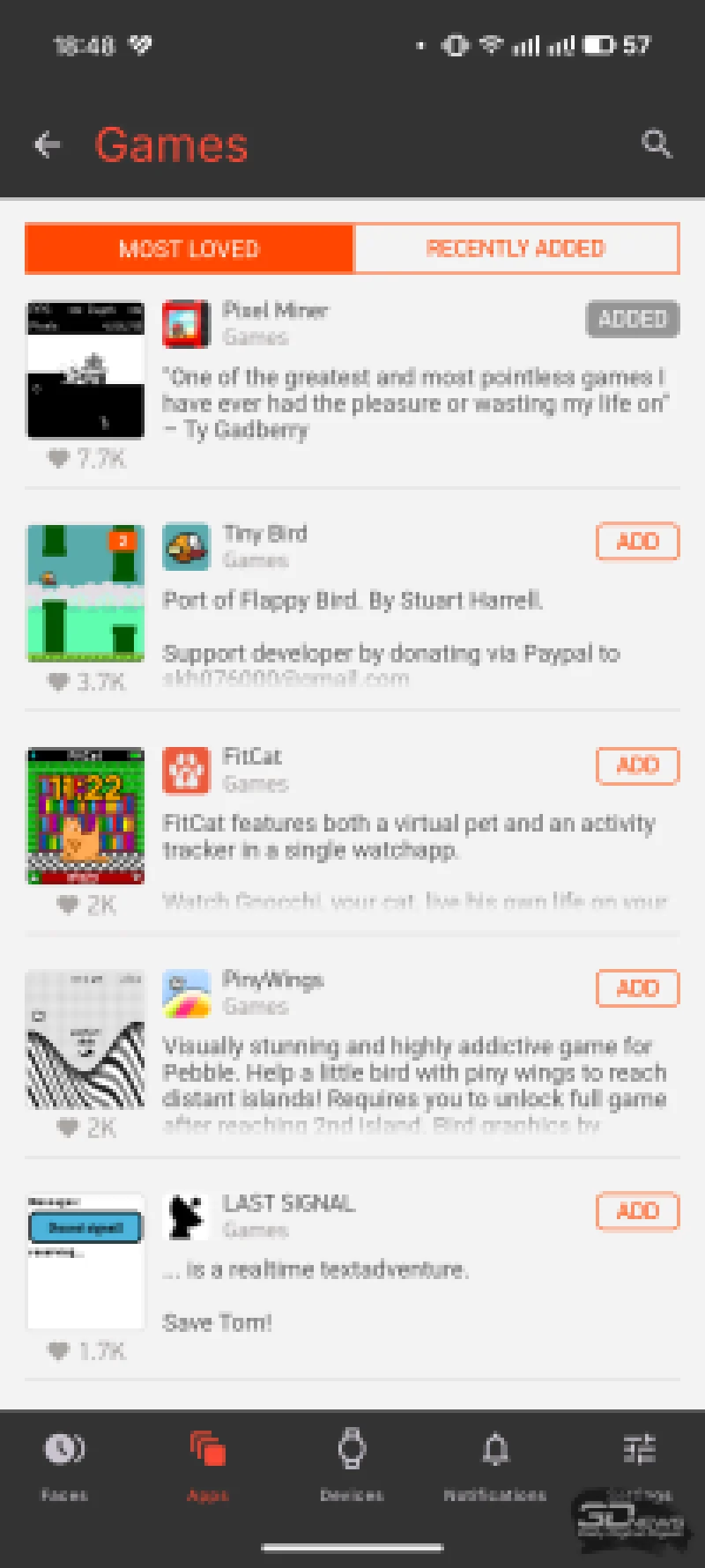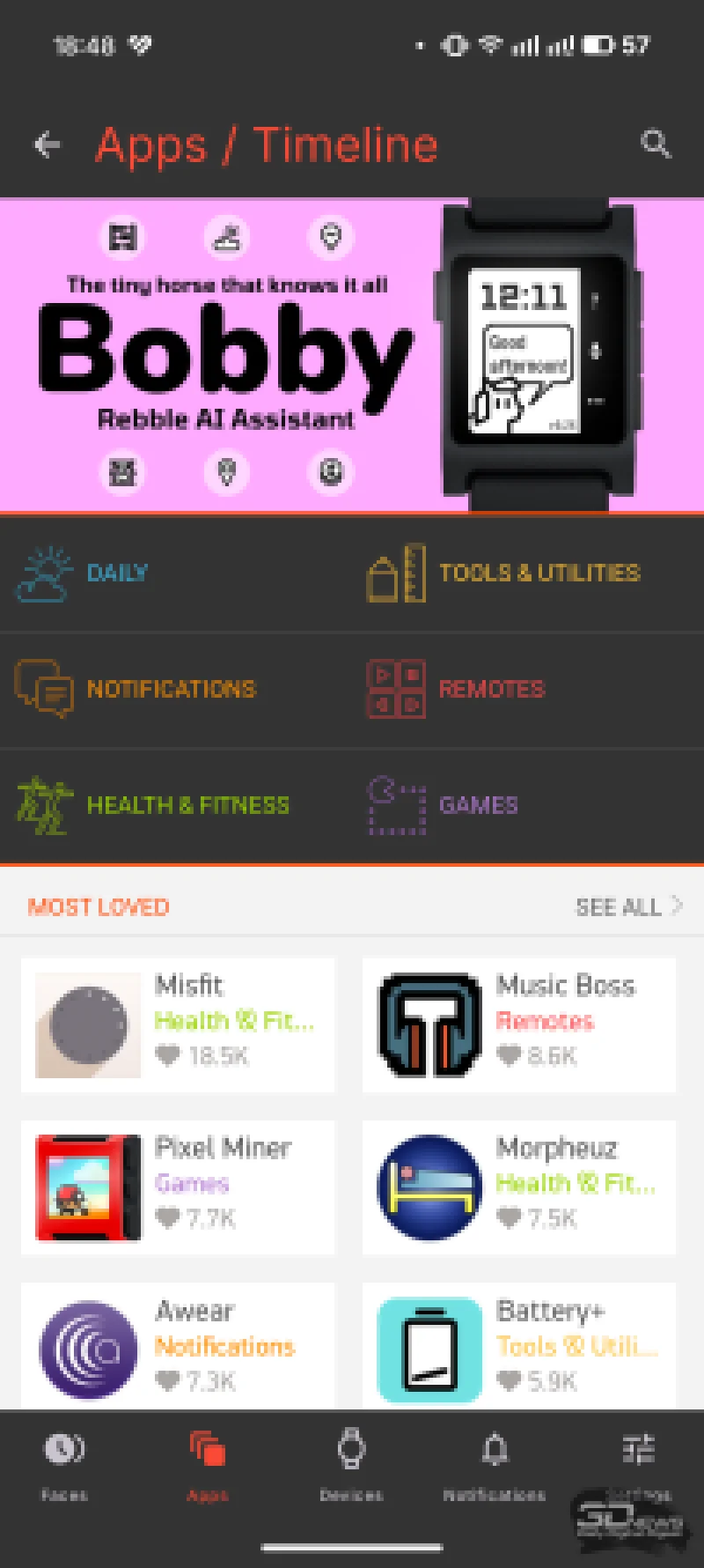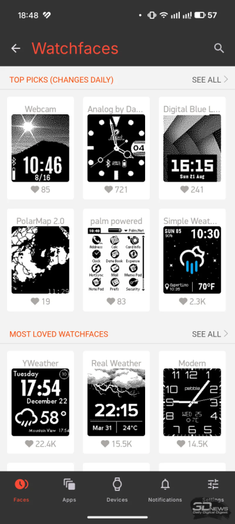 Но для начала о положительных сторонах, и лично мне особенно импонирует открытость этой платформы. Прежде всего, пользователям доступны тысячи разнообразных циферблатов. Загрузить их можно через официальный магазин RePebble Store, который интегрирован в фирменное мобильное приложение. Также существуют независимые площадки с приложениями, крупнейшая из которых — Rebble, фактически сохранившая и приумножившая всю библиотеку циферблатов от оригинальных часов Pebble. Наконец, если в магазинах не найдётся подходящего варианта, всегда есть возможность создать собственный дизайн циферблата — благодаря наличию SDK и открытой архитектуре платформы, на часы можно установить практически что угодно.
