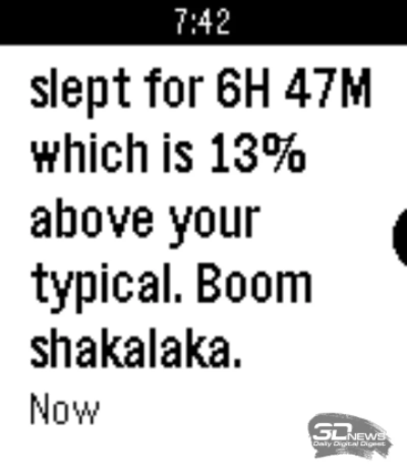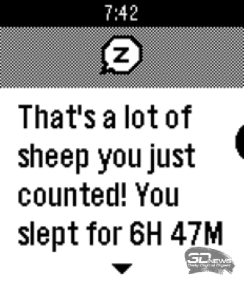 Pebble 2 Duo также могут анализировать продолжительность сна — здесь тоже предусмотрен просмотр данных за неделю. Функция будильника тоже присутствует: можно установить точное время пробуждения или выбрать интеллектуальный режим с получасовым интервалом. Вибрационный сигнал не отличается мощностью, но он вполне различим — его силы хватит, чтобы разбудить спящего человека.