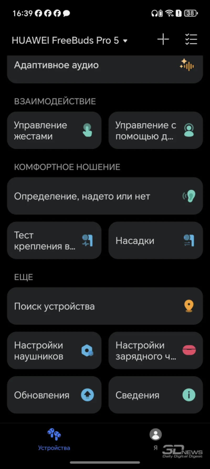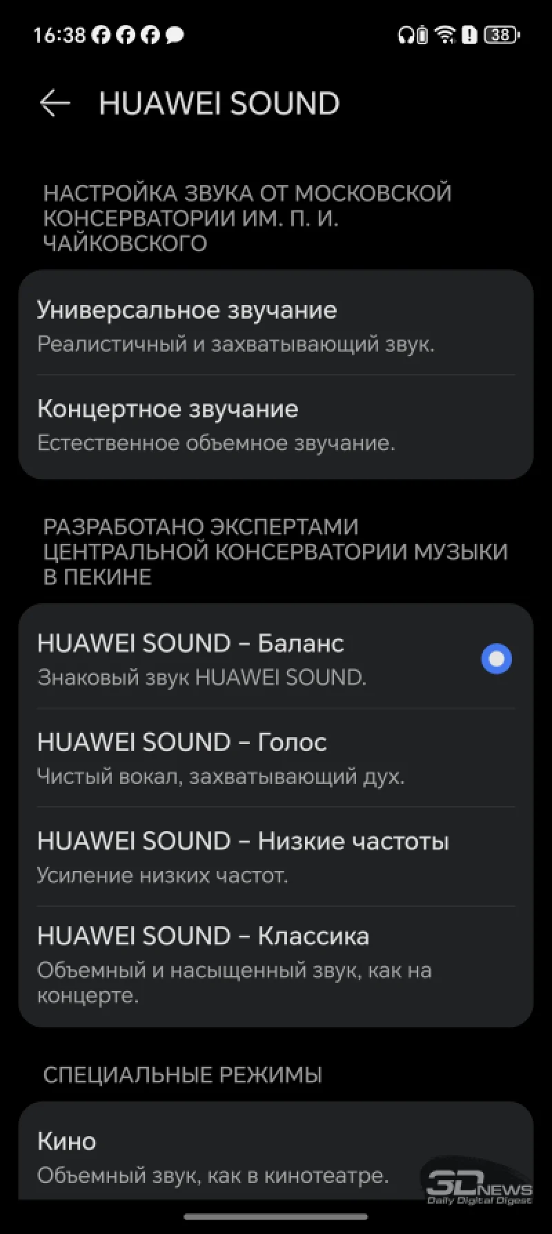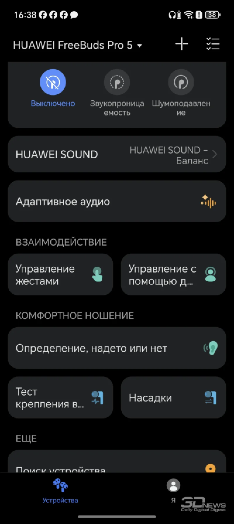 Среди нововведений — раздел Huawei Sound, который, по сути, представляет собой стандартный эквалайзер с предустановленными режимами: «Сбалансированный», «Вокал», «Басы» и «Классический». Заявлено, что эти профили были созданы при участии консерватории… в Пекине. А также, как уже упоминалось, добавлены два пресета от Московской консерватории. Получается своеобразный двойной союз консерваторий. Кроме того, здесь есть дополнительные режимы для различных ситуаций, например, для просмотра фильмов или игр. Доступна и ручная регулировка эквалайзера, а также функция адаптивного звука, когда наушники автоматически оптимизируют звучание под контент. Лично я в основном использовал HUAWEI FreeBuds Pro 5 с профилем «Сбалансированный».
