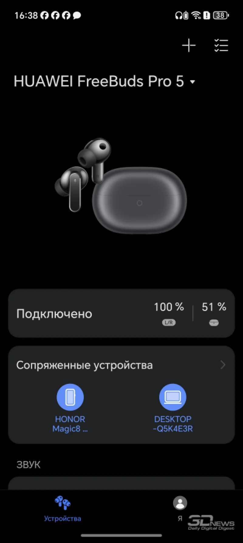 Для полноценного функционирования HUAWEI FreeBuds Pro 5 не нужны дополнительные приложения — они автоматически отображаются в перечне доступных для подключения девайсов, как только вы открываете футляр, но исключительно при использовании смартфона HUAWEI. С устройствами на Android или iOS наушники не стали соединяться в этом режиме, поэтому пришлось задействовать ту самую вытянутую кнопку на торце корпуса.