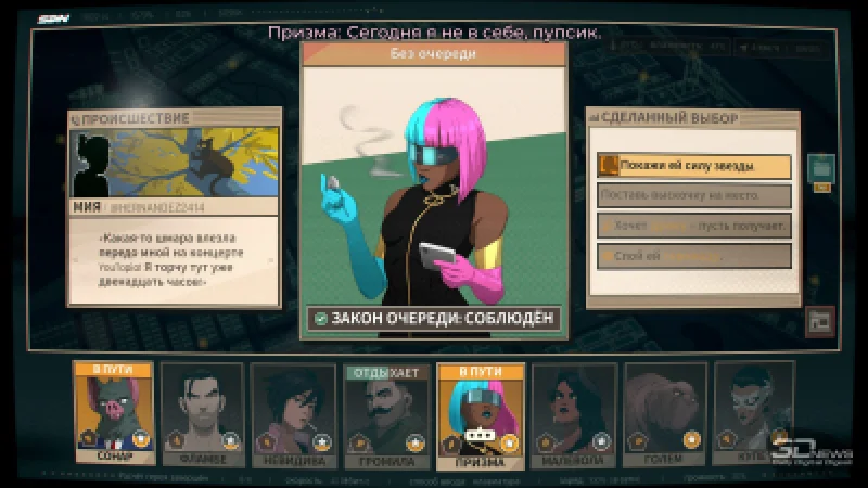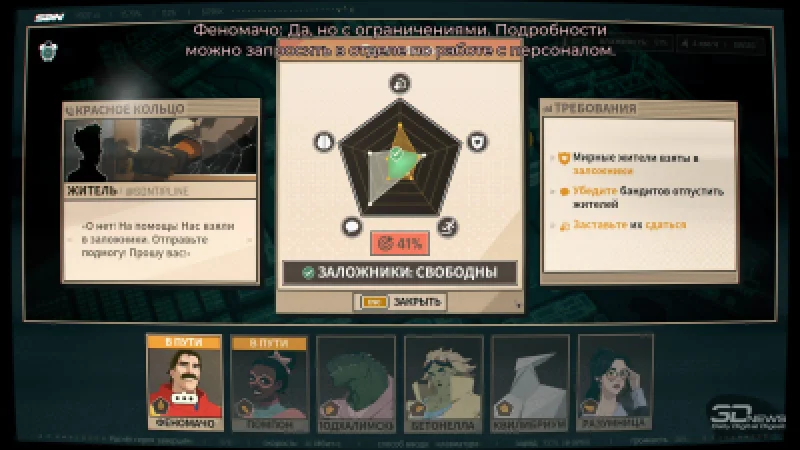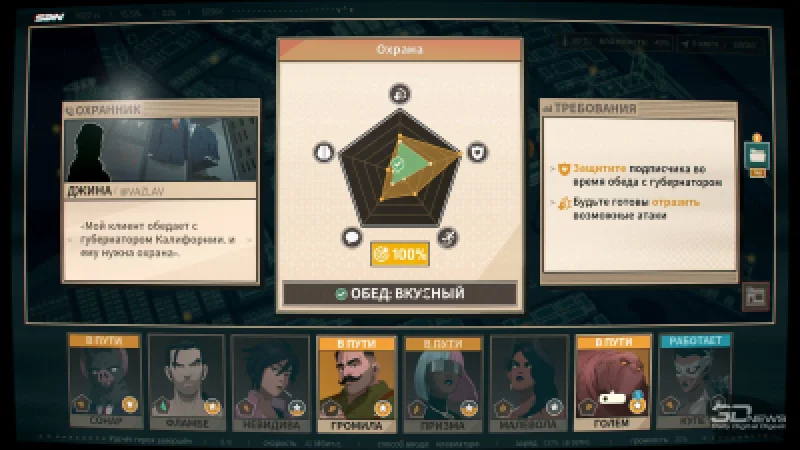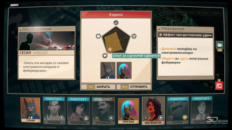 Узнаваемая механика Telltale в Dispatch дополнена игровыми элементами симулятора диспетчерской. В каждой серии вам предстоит отработать несколько дежурств, принимая звонки и направляя свою команду на решение происшествий. У миссий есть условия к параметрам, поэтому отряд следует формировать, учитывая достоинства и недостатки героев. Игра не называет точные значения, а лишь указывает на необходимые качества через текст. Скажем, если в сообщении звучит что-то вроде «требуется догнать группу преступников», лучше отправить самого проворного.