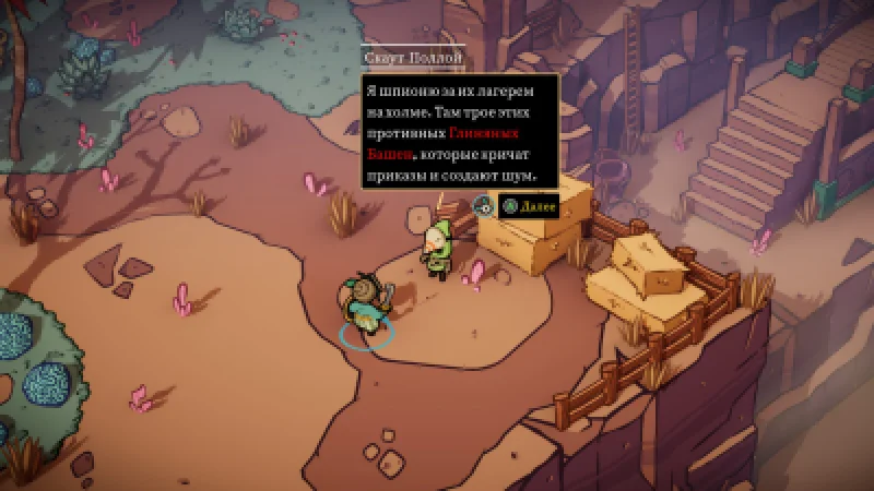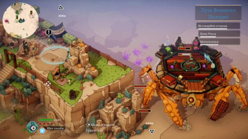В этом и заключается суть игры — не стоит ждать глубокого захватывающего сюжета, проект скорее напоминает «песочницу», где по пути к следующей цели постоянно встречаются разные занятия. То попадётся поселение, где пара поллоев просит о помощи, то встретится одинокий торговец с полезными товарами, то обнаружится вражеский пост с несколькими башнями, бесконечно порождающими противников. Между такими точками удобнее всего перемещаться верхом на краулере, а если нужно подняться на возвышенность, в этом помогут мостики по краям платформы на голове краба — правильно состыкуйтесь, и вы сможете сойти в нужном месте. Но иногда такой возможности нет: приходится спускаться с краба по лестнице и идти пешком, а потом возвращаться обратно и продолжать путь.