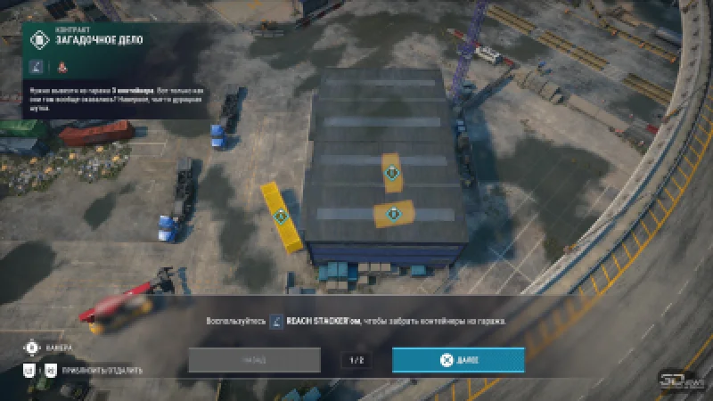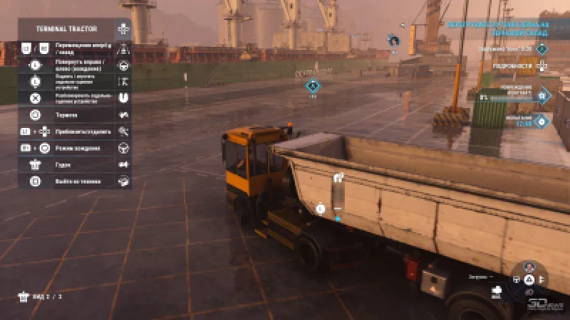 Это далеко не полный список ключевых отличий, выделяющих проект среди предшественников — здесь почти всё реализовано иначе. Мы не колесим по обширным локациям — вместо этого выбираем контракты в меню, видим экран загрузки, оказываемся в конкретной точке порта и выполняем одно-два поручения, после чего снова возвращаемся в меню. К примеру, вам может понадобиться перевезти опрокинувшуюся огромную цистерну из одного места в другое. Или разгрузить три контейнера с корабля — либо, наоборот, загрузить их. А иногда требуется подцепить прицеп, поместить на него краном мусор и отвезти в указанное место. На одни задания уходит пять минут, на другие — двадцать, но в целом с большинством задач удаётся разобраться достаточно быстро.