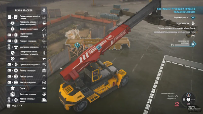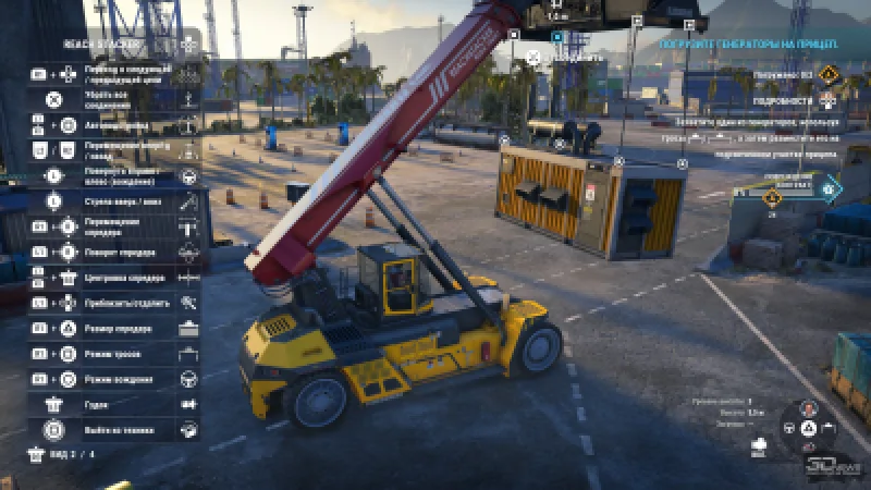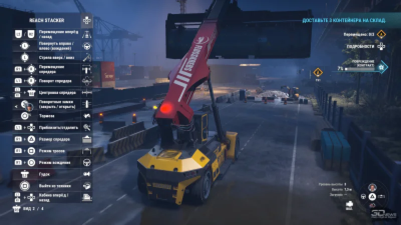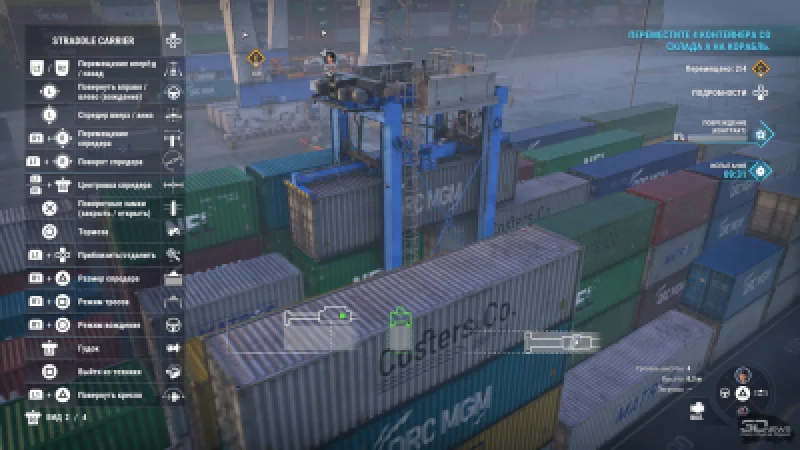 Основные игровые механики здесь связаны именно со спредерами, которыми оснащена почти вся доступная техника: и причальный кран, и ричстакер, и узкий высокий погрузчик, и рельсовый кран. Когда нужно просто поднять удобно стоящий контейнер, вы перемещаете спредер (или стрелу, на которой он закреплён) в направлении нужного объекта. Немного корректируете положение, насколько позволяет конкретная машина, и в нижней части экрана появляется подсказка, показывающая, насколько точно спредер расположен над контейнером. Когда эти всплывающие схемы становятся зелёными, груз можно захватить и спокойно продолжить выполнение задания.