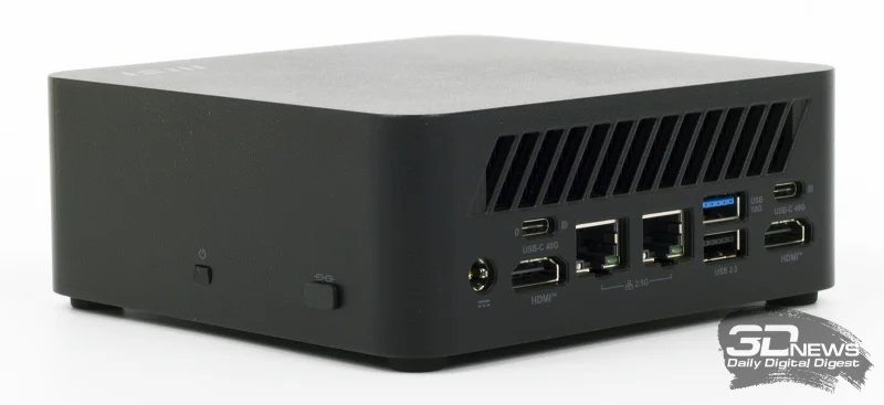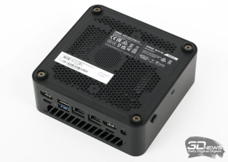 Как отмечалось ранее, компьютер удобно крепится за экраном монитора или телевизора. На рабочем столе модель Cubi Z AI 8M размещается исключительно горизонтально — для этого перфорированная нижняя крышка оснащена четырьмя резиновыми опорами. Основные интерфейсы устройства расположены на лицевой и тыльной сторонах корпуса. На передней панели находятся сразу четыре порта USB типа A, каждый из которых поддерживает скорость передачи данных до 10 Гбит/с. Здесь же размещены разъем 3,5 мм для гарнитуры и кнопка питания.