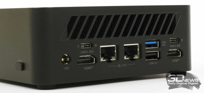 Тыльная панель предлагает большее количество портов. Разъем USB 2.0 предназначен для подключения беспроводных клавиатуры и мыши, что позволяет организовать рабочее место без лишних кабелей. Кроме того, система оборудована двумя сетевыми контроллерами с пропускной способностью до 2,5 Гбит/с каждый. Панель ввода-вывода включает два HDMI-выхода. Особого внимания заслуживает пара разъемов USB4, каждый из которых обеспечивает скорость до 40 Гбит/с. Оба интерфейса Type-C поддерживают стандарт DisplayPort 1.4. Таким образом, к Cubi Z AI 8M можно одновременно подключить до четырех дисплеев. Один из портов USB4 совместим с технологией Power Delivery 3.0, поддерживая входную мощность до 100 Вт. Кроме того, эти разъемы могут подавать до 15 Вт для зарядки подключенных мобильных устройств и внешних аккумуляторов.
