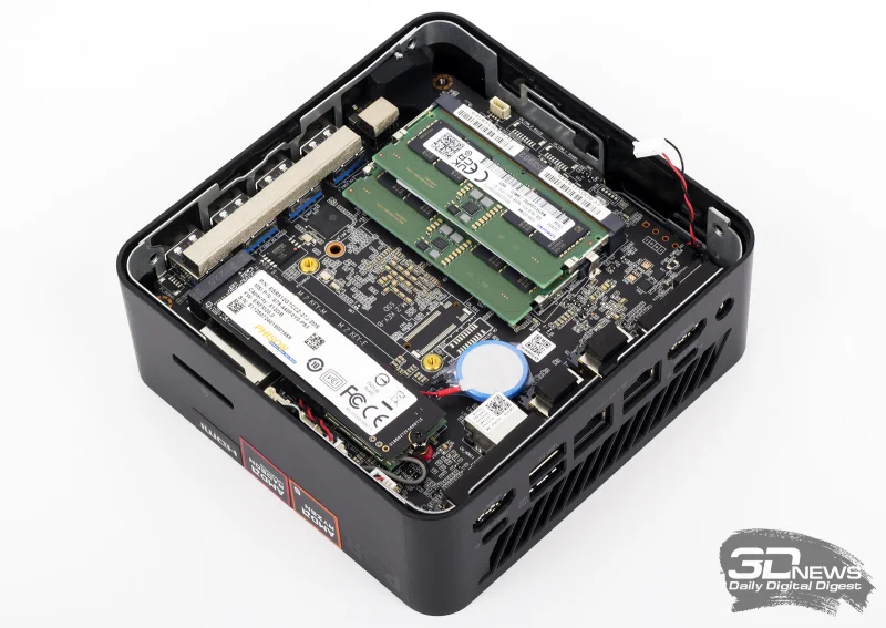 Нижняя крышка мини-ПК, выполненная из металла, демонтируется без особых усилий — для этого нужно выкрутить всего четыре винта. На этой алюминиевой пластине зафиксированы динамик, микрофон и небольшая плата, которая обеспечивает подключение внешней кнопки питания. Снимайте её осторожно, не торопясь. После этого частично разобранный корпус открывает доступ к съёмным накопителям и беспроводному адаптеру. В нашей тестовой модели — Cubi Z AI 8M-008XRU — установлено 16 ГБ оперативной памяти в формате двух модулей DDR5-5600, а также SSD на 512 ГБ с интерфейсом PCI Express. Материнская плата не имеет дополнительных слотов расширения, хотя на фотографии отчётливо видны контактные площадки для возможного монтажа ещё одного разъёма M.2. Тем не менее, разработчики MSI ограничились одним слотом для накопителя. Таким образом, модернизация системы в будущем будет заключаться только в замене уже установленных компонентов.
