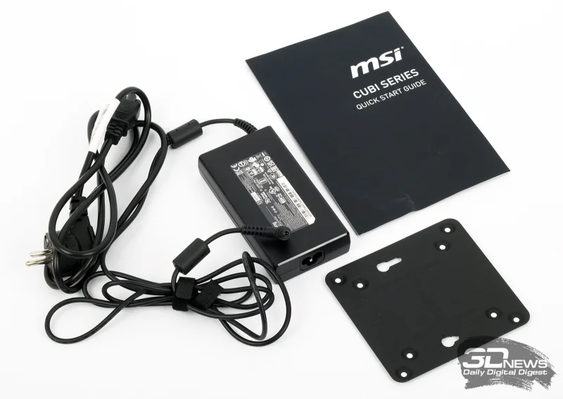 Рассматриваемая система отличается малыми габаритами. Если говорить точнее, объём её корпуса не превышает 0,9 литра. Устройство свободно умещается на ладони. С его переноской не возникнет никаких трудностей, хотя обычно такой ПК, как Cubi Z AI 8M, размещают скрыто — за экраном монитора или телевизора. Процесс монтажа «кубика» отнимет всего несколько минут. Стоит учесть наличие внешнего блока питания весом около 500 грамм — без него система не функционирует. Тем не менее, полагаю, что читателям 3DNews не составит труда аккуратно организовать провода на своём рабочем месте.
