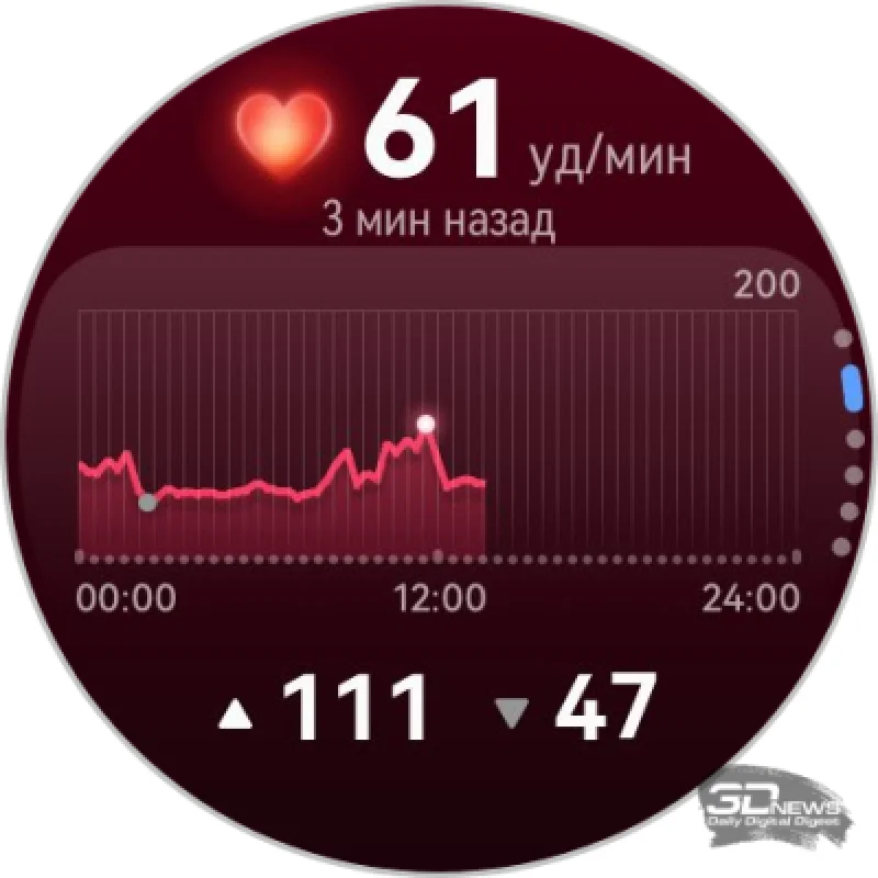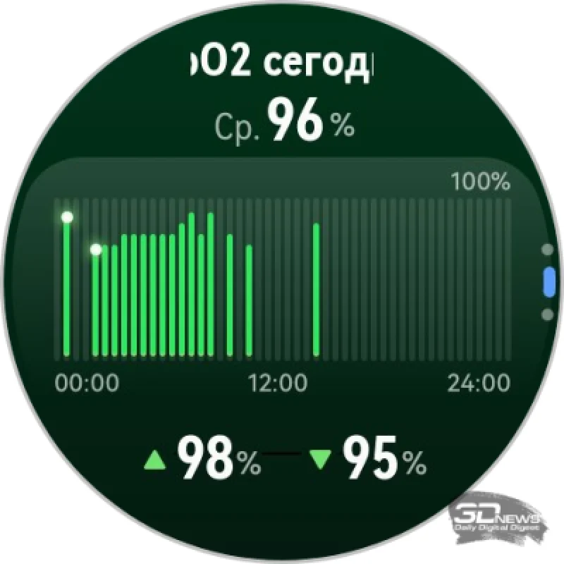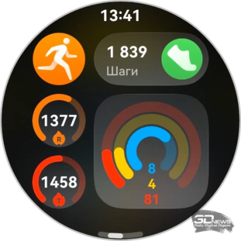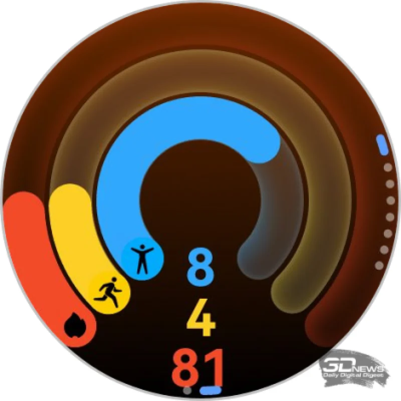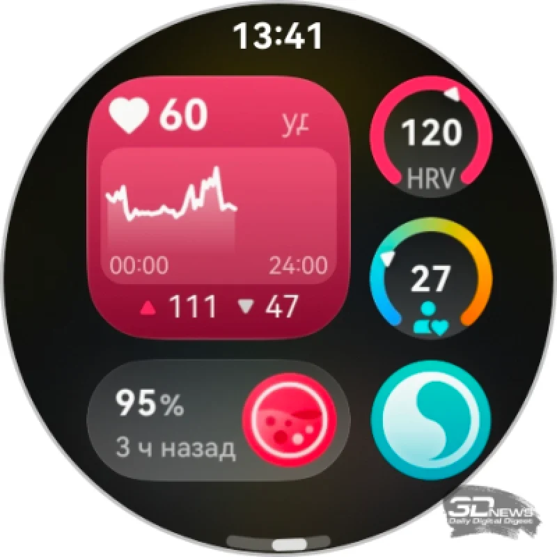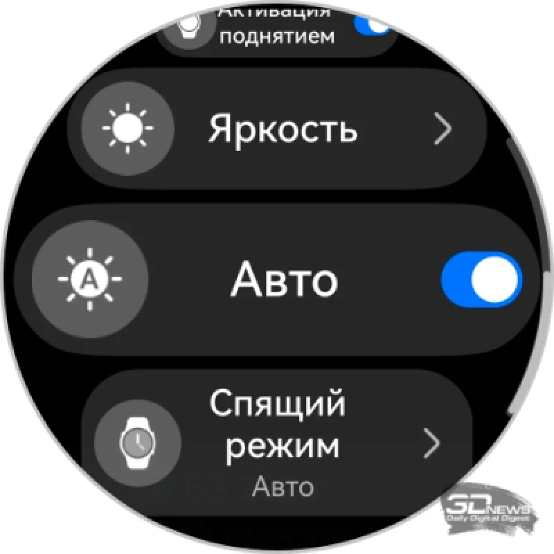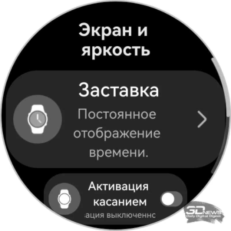 Дисплей практически не претерпел изменений: диагональ составляет 1,5 дюйма, разрешение – 466 × 466 (плотность пикселей 311 ppi). Используется матрица LTPO 2.0 AMOLED с адаптивной частотой обновления от 1 до 120 Гц. Экран, естественно, сенсорный. С яркостью не возникает никаких затруднений – заявленный пиковый показатель достигает 3500 кд/м2; сложно судить, насколько эта величина достижима в реальных (а не тестовых) условиях, однако в любом случае считывание информации с дисплея не представляет никаких сложностей.