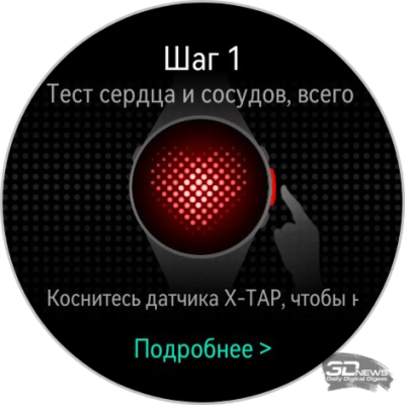Нововведением для линейки WATCH Ultimate стал датчик X-TAP, расположенный между двумя упомянутыми кнопками. Он объединяет электрокардиограф, пульсоксиметр и фотоплетизмографический сенсор. При удержании пальца на этом элементе запускается комплексная диагностика состояния организма: измеряются пульс, ЭКГ, сатурация крови, уровень стресса, эмоциональный статус, температура кожи, а также оценивается жёсткость артерий и функция дыхательной системы (в процессе требуется несколько раз прокашляться).