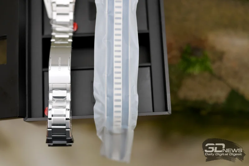 Модель HUAWEI WATCH Ultimate 2 представлена в двух вариантах – черном и сине-белом. Причем различия заключаются не только в цветовой гамме, но и в размерах – синяя версия по неизвестной причине немного габаритнее. Она также комплектуется более богатым набором аксессуаров: помимо уже установленного фторэластомерного ремешка, окрашенного в цвет корпуса, в упаковке присутствует титановый ремешок и дополнительный удлиненный фторэластомерный вариант. Черная версия также включает два ремешка разной длины, но без титановой альтернативы.