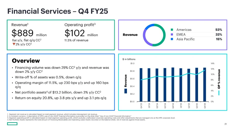 Доход HPE от гибридных облачных решений сократился на 12%, составив $1,41 млрд, с операционной маржой в 5% против 7,8% годом ранее. При этом выручка от сетевого оборудования выросла на 150%, достигнув $2,81 млрд. Операционная маржа в этом сегменте снизилась до 23% с 24,4% за аналогичный период прошлого года. Финансовый сервис показал стабильный результат — $889 млн. Суммарная годовая выручка компании увеличилась на 14%, достигнув $34,3 млрд.