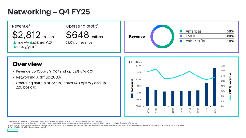 Нери уточнил, что за прошедший год клиентская база IT-услуг «как сервис» GreenLake пополнилась примерно 7 тысячами новых заказчиков, достигнув к концу отчётного периода 46 тысяч. Он подчеркнул, что HPE превратилась в «компанию, сфокусированную на сетевых решениях», которая готова «обеспечивать выдающиеся перспективы и потенциал для роста как в области облачных технологий, так и в сфере искусственного интеллекта», как передаёт The Register. Корпорация повысила годовой прогноз роста выручки от сетевого оборудования до +65–70 % по отчётным данным, что, согласно расчётам ресурса MSN, предполагает объём выручки около $11 млрд.