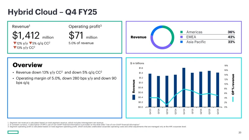 По отчётности HPE, операционный убыток по стандартам GAAP за квартал составил $8 млн, тогда как за аналогичный период прошлого года была зафиксирована прибыль в $693 млн. Чистая прибыль компании в четвёртом квартале достигла $146 млн, или 11 центов на разводнённую акцию, что существенно ниже показателя годичной давности в $1,34 млрд, или 99 центов на акцию. Годовой регулярный доход (ARR) продемонстрировал рост на 63% в годовом исчислении, достигнув $3,2 млрд.