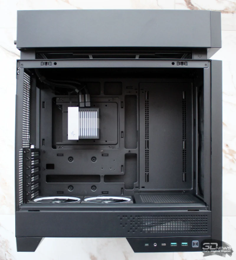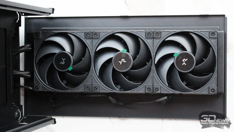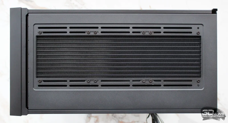 После снятия верхней крышки открывается вид на 360-мм радиатор и посадочные места для 140-мм кулеров, однако установить 420-мм радиатор не получится — он не поместится в этот корпус из-за недостаточной длины.