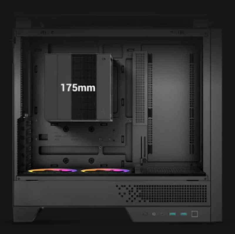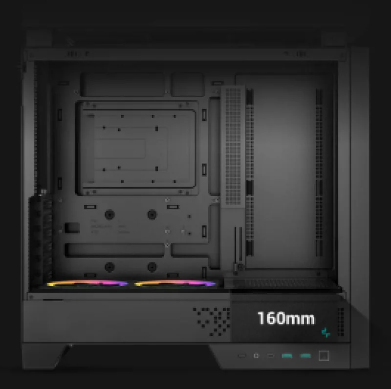 В модели DeepCool CL6600 отсутствует традиционная перегородка, разделяющая основное пространство для компонентов и отсек для блока питания с накопителями. Блок питания размещается в собственном перфорированном отсеке, а остальную площадь занимают два заранее установленных 120-миллиметровых вентилятора DeepCool FL12R SE ARGB, оснащённых реверсивными лопастями.