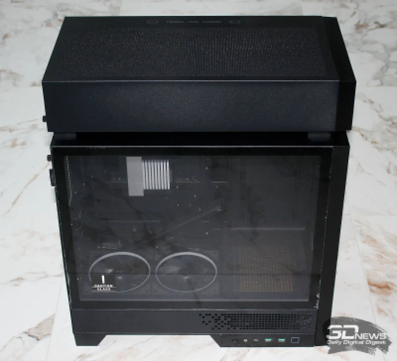Если снять крышку с верхнего модуля корпуса, с торца становятся видны радиатор, вентилятор, а также фитинги с трубками системы жидкостного охлаждения.