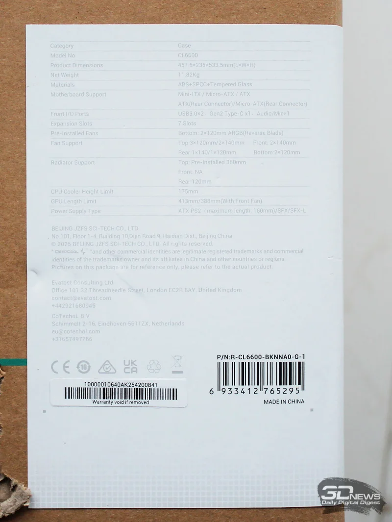 На белой этикетке, размещённой на коробке, указаны ключевые характеристики корпуса, а также штрих-коды с информацией о стране-производителе.