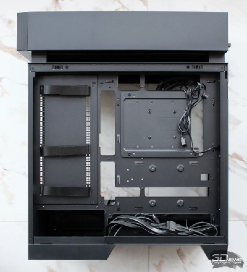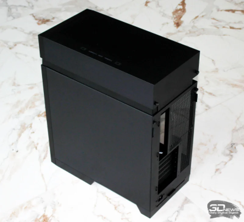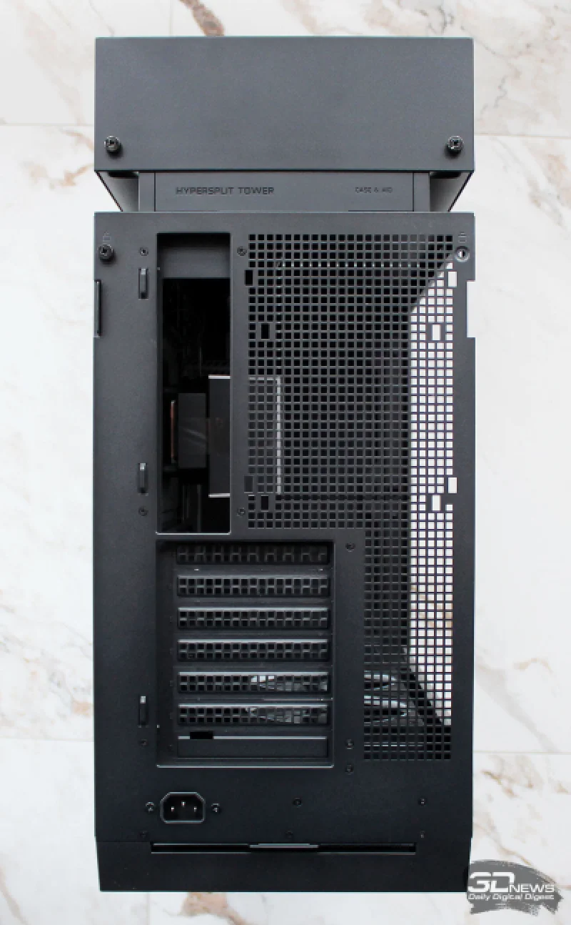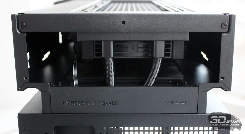 Верхняя панель основного модуля корпуса практически сплошная, за исключением прорези для шлангов системы охлаждения, которые ведут в верхний модуль.