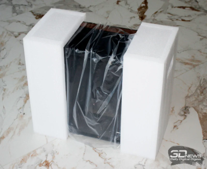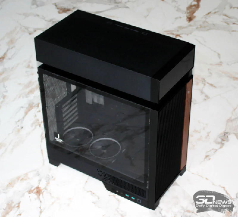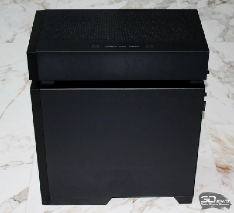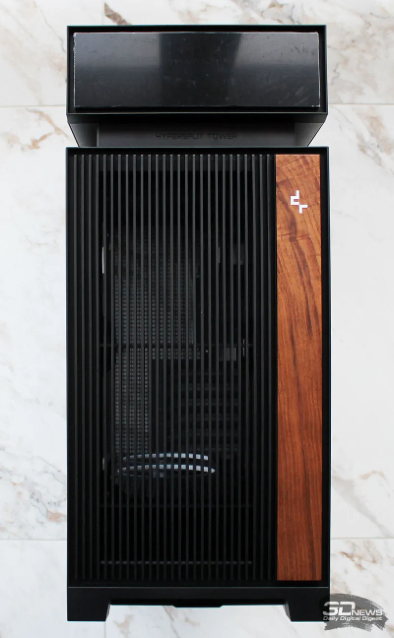 Передняя панель целиком изготовлена из пластика и имеет вид вертикальной решётки с узкой полосой, стилизованной под дерево и украшенной логотипом бренда. Верхняя фронтальная панель также пластиковая, и, на наш взгляд, здесь было бы уместно разместить дисплей для отображения системной информации. Не исключено, что подобная версия появится в будущем.