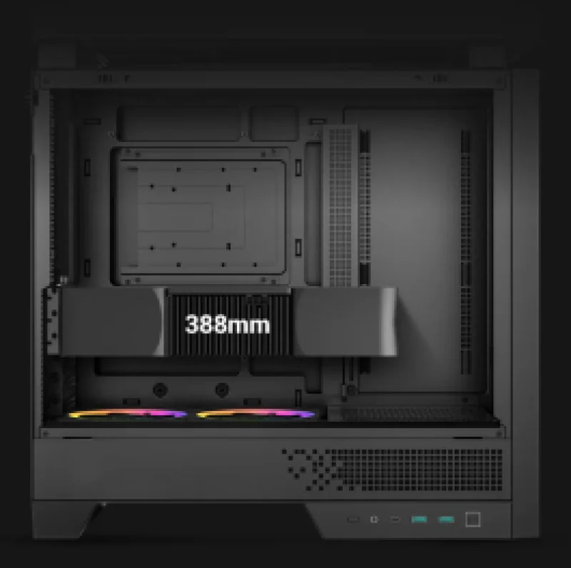 Внутреннее пространство корпуса отличается значительной вместимостью: здесь можно разместить кулер для процессора высотой до 175 мм, а видеокарту длиной до 413 мм, либо 388 мм, если спереди установлены вентиляторы.