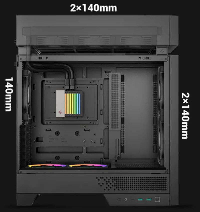 Примечательно, что это один из немногих случаев, когда в передней части корпуса можно разместить 140-мм вентиляторы, но не 120-мм (обычно наблюдается обратная ситуация).
