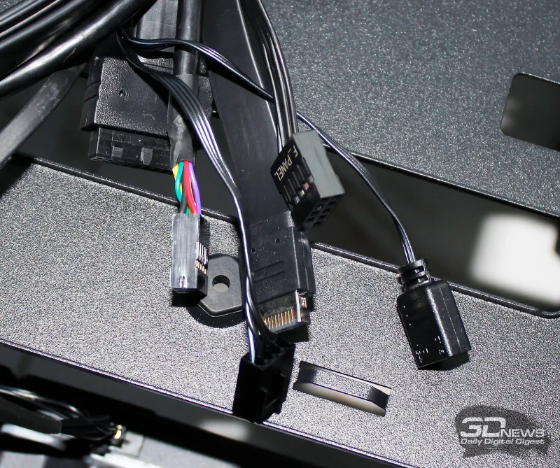 Комплект кабелей корпуса является стандартным: два кабеля USB разных типов, аудиокабель, кабель для разъёмов передней панели, а также 4-пиновый коннектор с ARGB-кабелем для управления подсветкой вентиляторов.