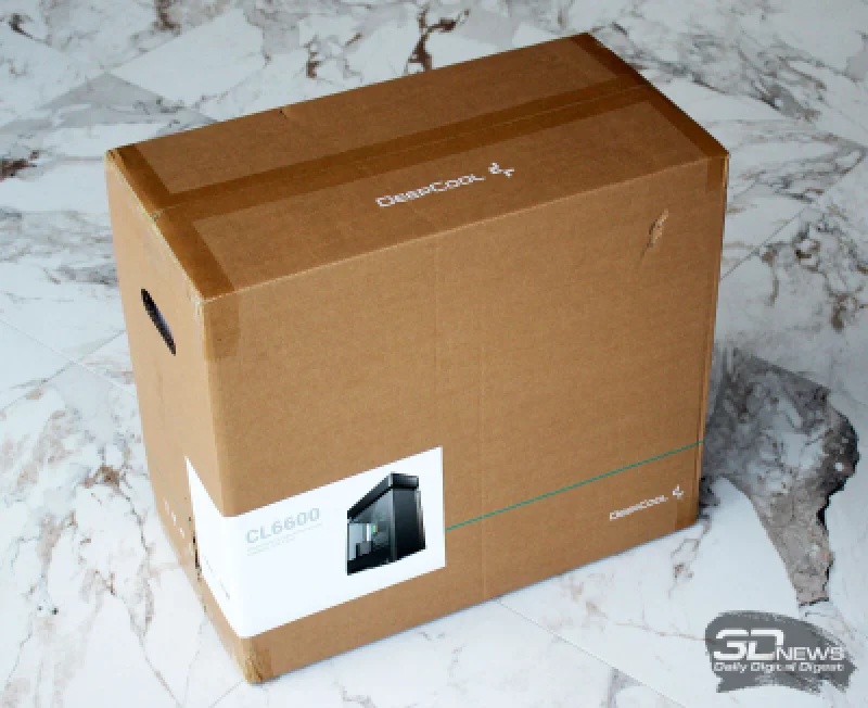 Корпус DeepCool CL6600 поставляется в стандартной упаковке, размеры которой характерны для моделей данного форм-фактора, а оформление выполнено в минималистичном стиле. Боковые стороны коробки оснащены ручками для удобной переноски, что весьма кстати, учитывая её немалый вес. Внутри корпус надёжно защищён двумя слоями пенополиэтилена и дополнительно упакован в защитный пакет.