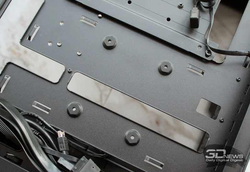 Ещё один SSD размером 2,5” можно разместить немного ниже — на тыльной стороне перегородки, где для крепления предусмотрены четыре резиновые стойки.