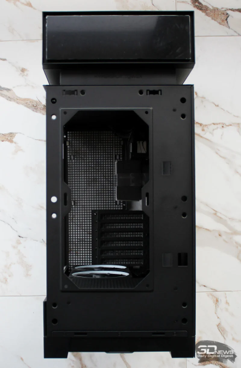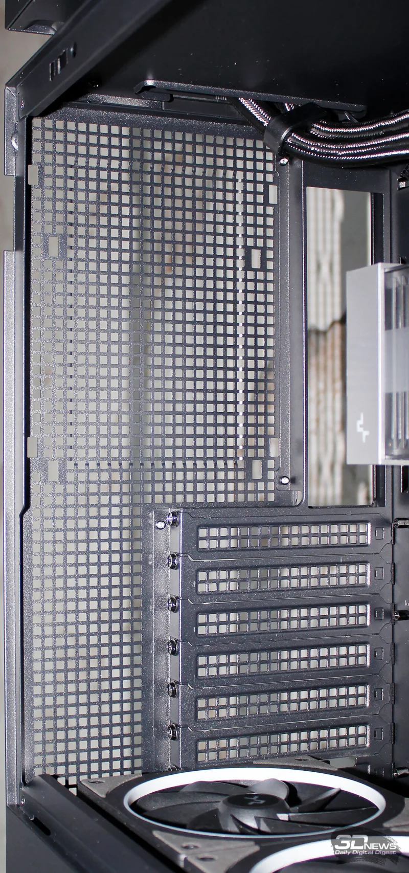 С задней стороны привлекает внимание обширная вентиляционная область, протянувшаяся от места крепления вентилятора до края перфорированных заглушек слотов PCI Express. Также стоит выделить пространство толщиной 35 мм за креплением материнской платы, предназначенное для монтажа накопителей и укладки кабелей.