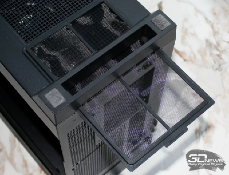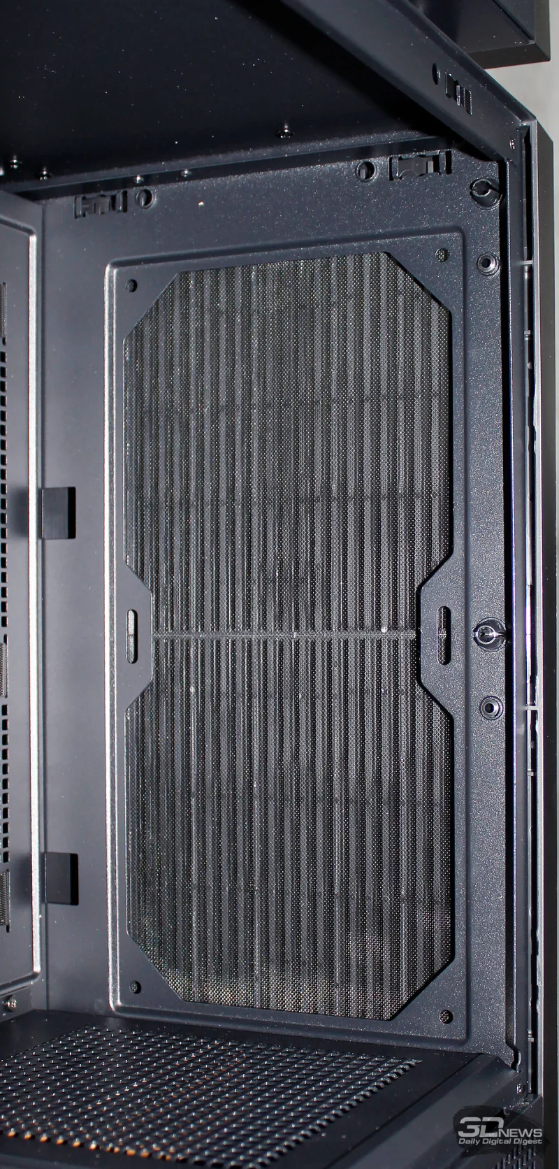 Теперь рассмотрим переднюю панель корпуса изнутри: здесь мы видим закреплённый пылевой фильтр и перфорацию с прорезями для монтажа пары 140-мм вентиляторов.