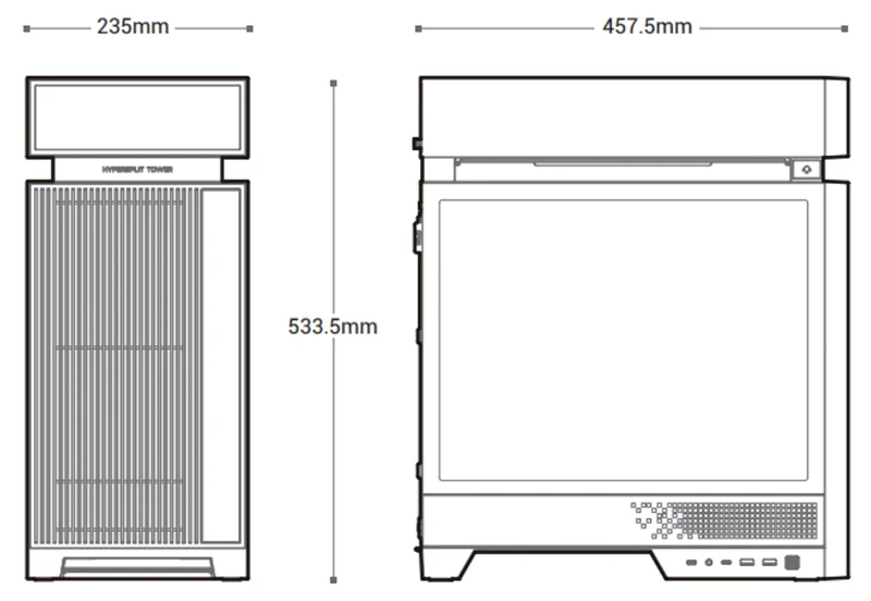 Несмотря на оригинальный дизайн, размеры устройства соответствуют стандарту Mid-Tower: высота составляет 533,5 мм, длина — 457,5 мм, а ширина — 235 мм.