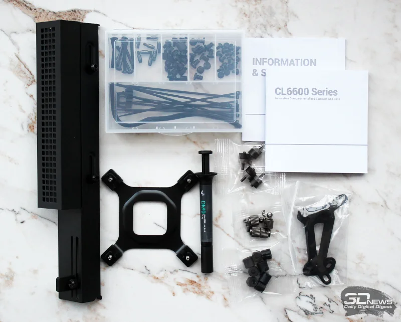 Внутри корпуса находятся все необходимые компоненты: съёмная планка для маскировки кабелей и поддержки видеокарты, пластиковый контейнер с различными винтами и стяжками, руководство по сборке, а также комплект креплений для помпы-водоблока процессора, включая термопасту.