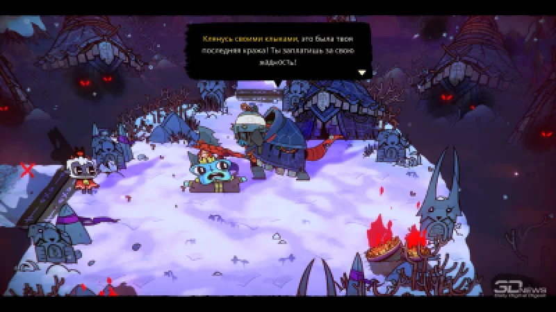 Уникальный визуальный стиль Cult of the Lamb, смешивающий трогательную милоту и пугающую хтонь, по-прежнему великолепен. Сочетание «гнилой» и «снежной» цветовых гамм создаёт весьма занятный контраст. |