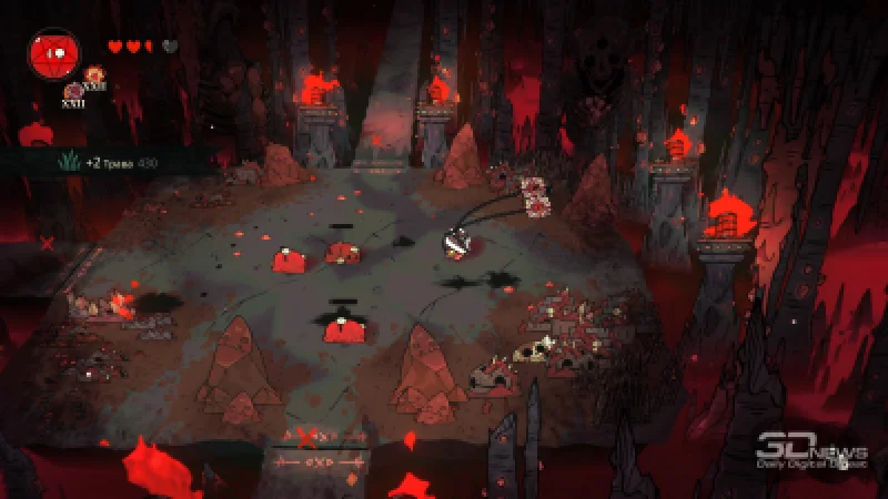 Боевая механика в дополнении сохранила прежнюю основу, хотя и обогатилась новыми элементами, такими как легендарные модификации для известного вооружения и добавление кистеня — исключительно удобного в бою оружия, которое также позволяет мгновенно сближаться с противником. Структура проходов осталась практически неизменной, однако система общего прогресса была немного переработана — теперь необходимо очищать ключевые точки на склонах горы, открывая тем самым путь к пику или скрытым зонам. Каждая такая точка представляет собой отдельный вылазку со знакомыми компонентами: арены, развилки, сбор ресурсов, спасение приверженцев и усиление через карты Таро. Колода карт, к слову, пополнилась свежими вариантами — среди них способность заморозить время при получении удара, обрести кратковременную неуязвимость или случайным образом потерять/восстановить часть здоровья при переходе на новую арену.