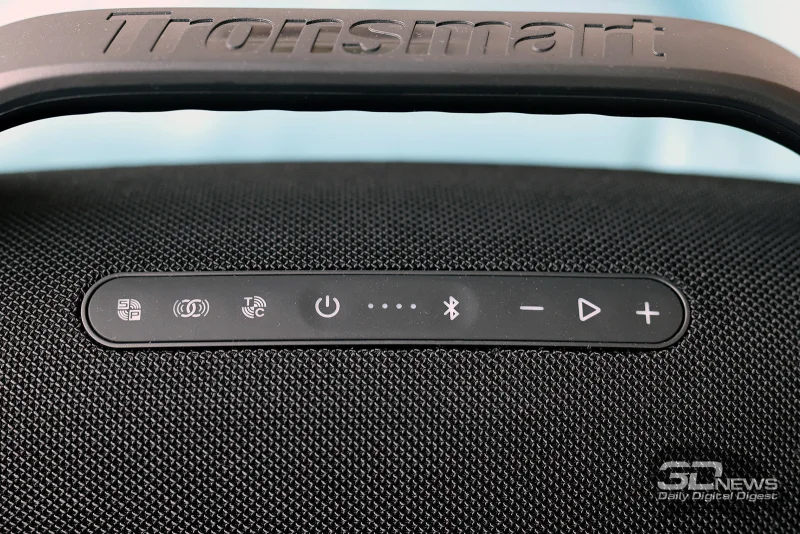 Подключение акустики к источнику звука осуществляется либо через провод (с помощью стандартного разъёма 3,5 мм), либо через Bluetooth (что является основным вариантом). В Tronsmart Bang 2 используется модуль Bluetooth версии 5.3 с поддержкой профилей A2DP, AVRCP, HFP, HSP. Однако доступен только кодек SBC, поэтому не стоит ожидать передачи звука высокого разрешения. Процесс сопряжения интуитивно понятен — для обычного подключения не требуется устанавливать дополнительные приложения. Более того, колонка автоматически переходит в режим поиска при первом включении; во время тестирования кнопка Bluetooth использовалась лишь для проверки работы с различными источниками сигнала.