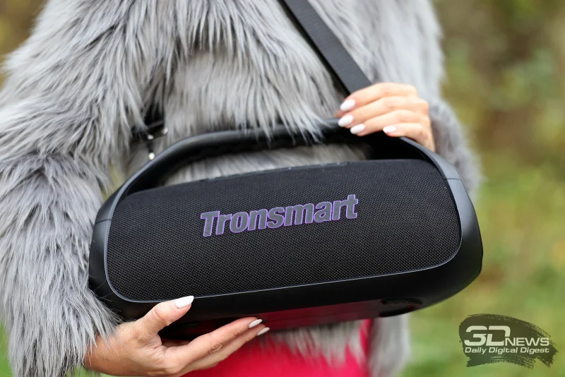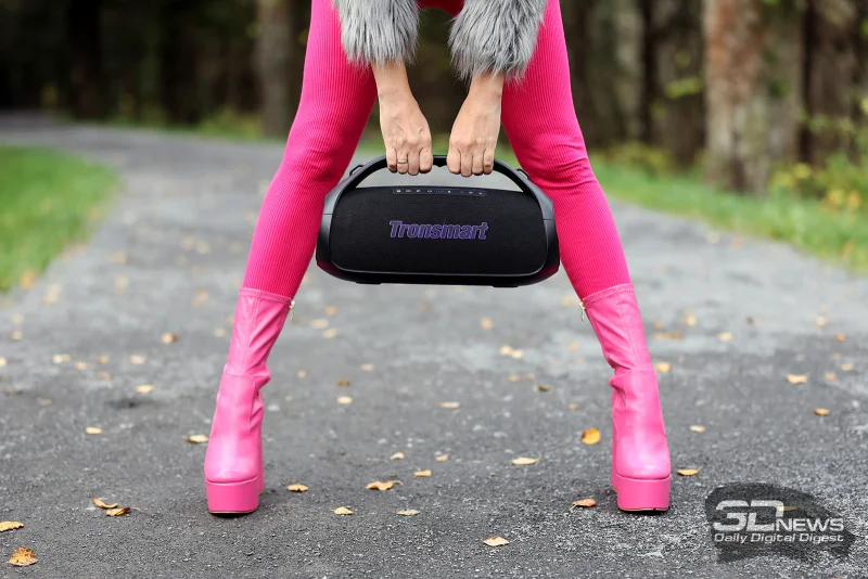Размеры Tronsmart Bang 2 составляют 381 × 152,4 × 203,2 мм при весе 2,27 кг. Устройство нельзя назвать компактным (в сравнении с той же Halo 300), и в рюкзак оно уже не поместится. Однако переносить колонку сможет даже человек хрупкого телосложения, поскольку вес распределен комфортно.