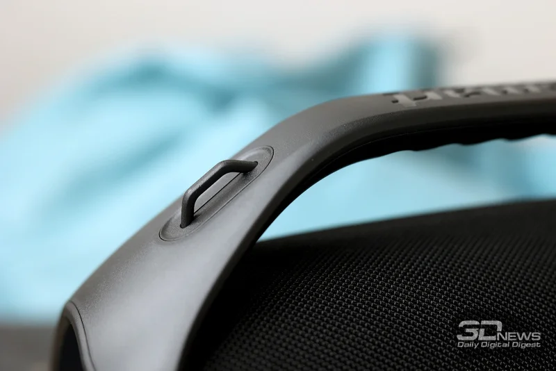 Внешняя отделка выполнена из пластика (ручка, плавно соединяющаяся с обрамлением корпуса), текстиля и мягкого софт-тач покрытия на панели управления. К сожалению, область ручки для переноски также пластиковая, как и основная конструкция, поэтому тактильные ощущения при перемещении колонки оставляют желать лучшего.