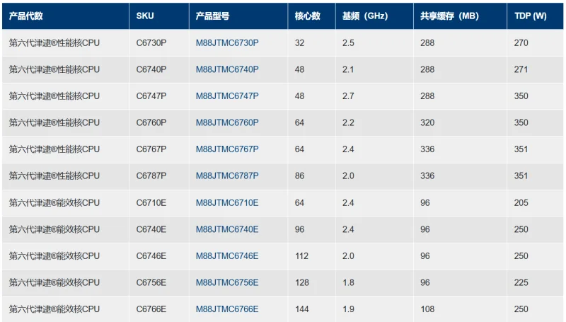 В частности, были анонсированы модели Jintide C6P, по сути являющиеся процессорами Intel Xeon 6 линейки на производительных P-ядрах. Количество таких ядер в китайских чипах доходит до 86, что позволяет обрабатывать до 172 потоков команд, а максимальный кэш L3 достигает 336 МБ. Реализована 8-канальная подсистема памяти DDR5 с поддержкой модулей RDIMM-6400 и MRDIMM-8000.