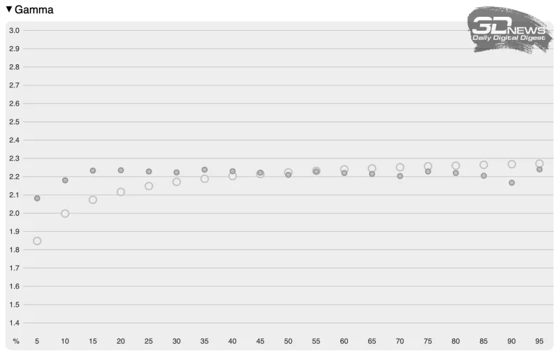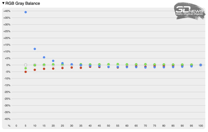 Баланс серого сохраняет устойчивость на протяжении почти всей шкалы яркости.