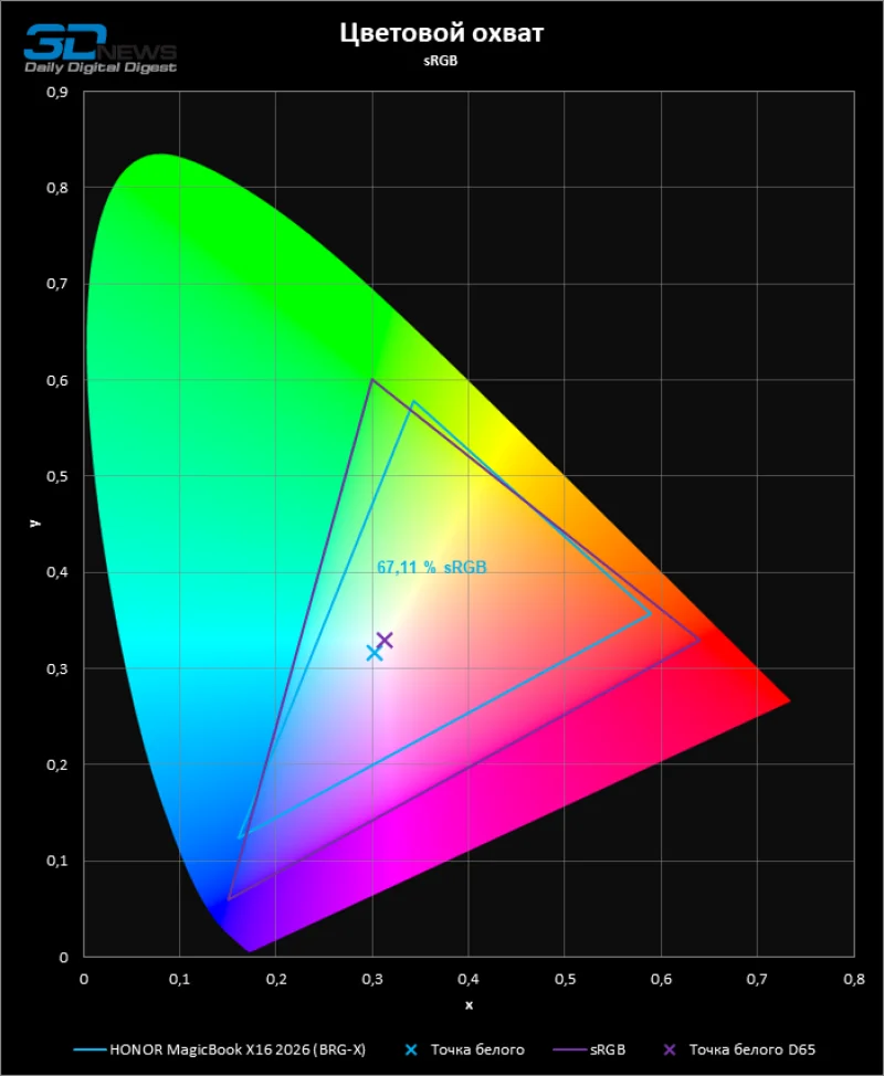 Цветовой охват экрана ограничен и покрывает лишь 67% от пространства sRGB.