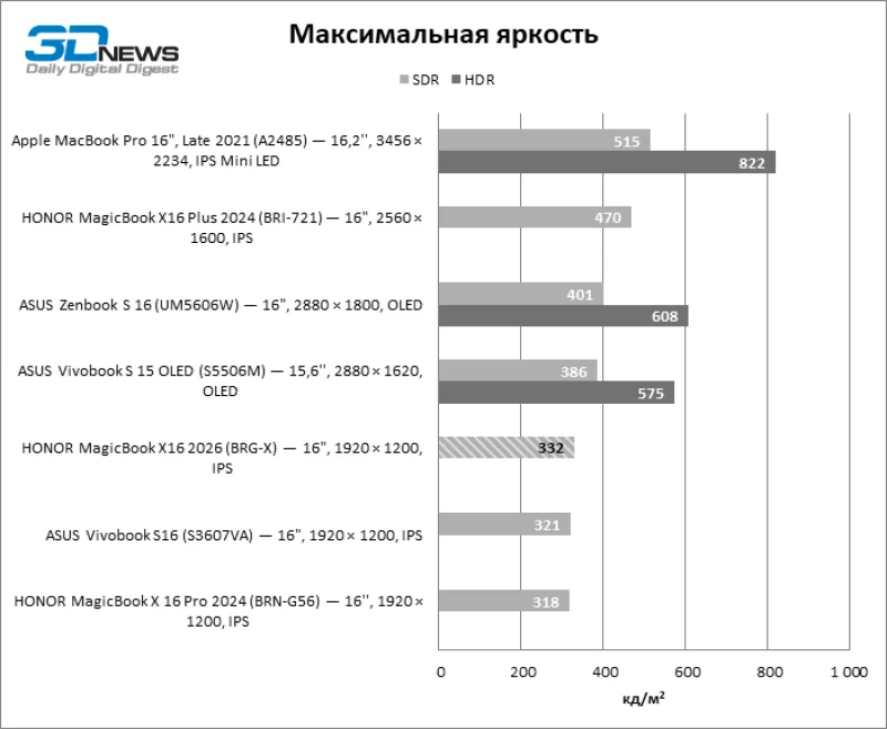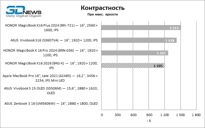 Дисплей MagicBook X16 2026 демонстрирует умеренную яркость — до 332 нит — и характерный для IPS-матриц уровень контраста — 1 200:1.