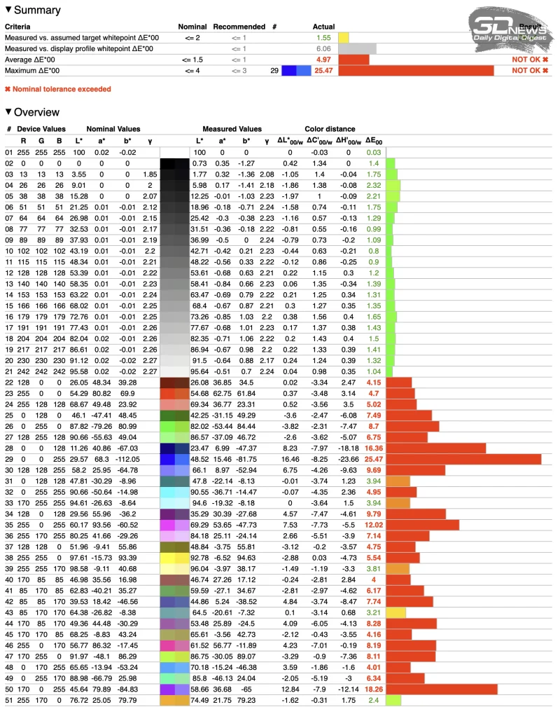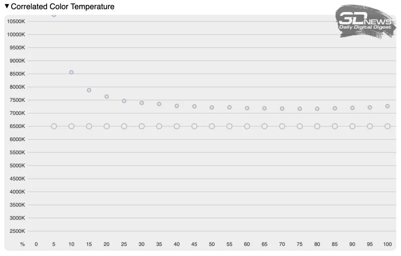 Хотя в системе отсутствует профиль, описывающий свойства матрицы, её калибровка выполнена на приемлемом уровне. Цветовая температура слегка превышает эталонные 6 500 K, но остаётся стабильной на большей части диапазона яркостей.