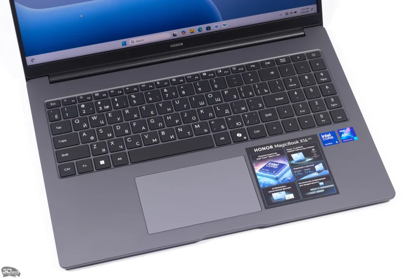 Просторная верхняя панель позволила разместить клавиатуру полного размера с цифровым блоком. Компактными, как это часто бывает, оказались лишь клавиша «~» и правый Shift. Клавиши обладают ходом 1,5 мм и обеспечивают четкое тактильное срабатывание. Из-за недостаточной жесткости тонкого штампованного корпуса клавиатурная панель может слегка прогибаться при нажатии, но сами клавиши не издают дребезжащего звука во время печати. Крышки клавиш выполнены из обычного шероховатого пластика, их символы не имеют подсветки. В MagicBook X16 2026 также отсутствуют биометрические сканеры.